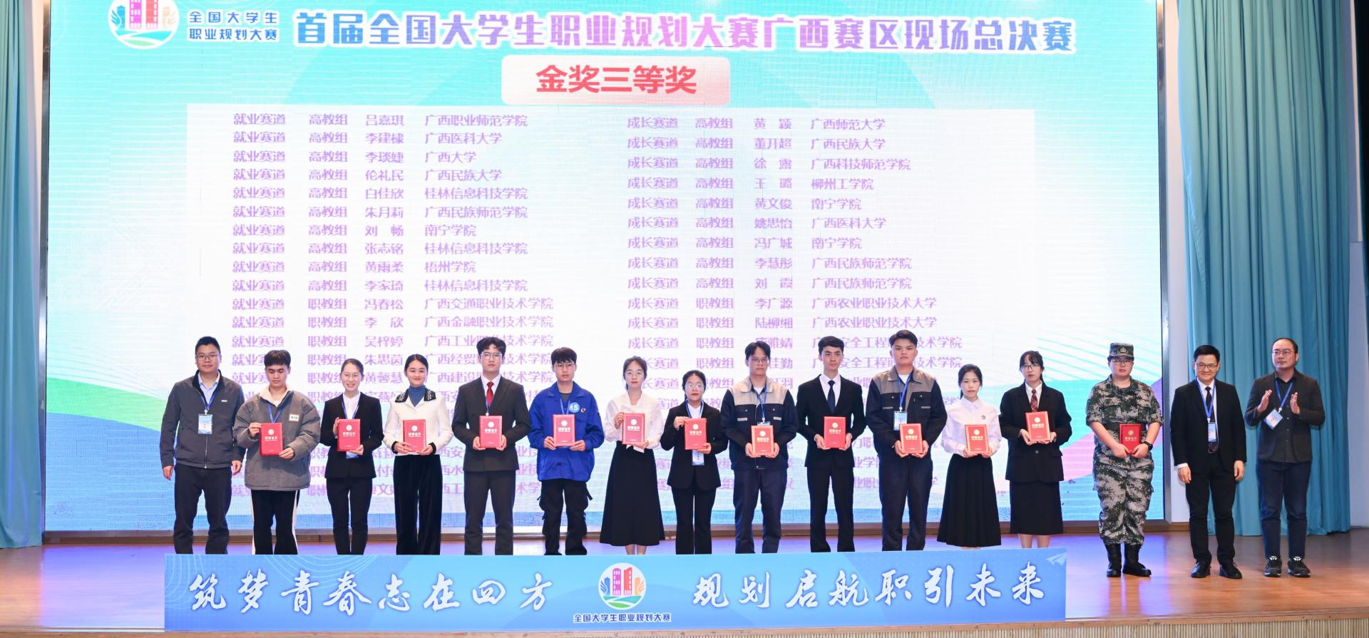 根据《自治区教育厅关于公布首届全国大学生职业规划大赛广西赛区获奖名单的通知》(桂教学生〔2024〕8号)传来喜报,南宁学院选送18名选手分别参加高教组、职教组的就业赛道、成长赛道,共收获4个区赛金奖、5个银奖、9个铜奖,学校获“优秀组织奖”。