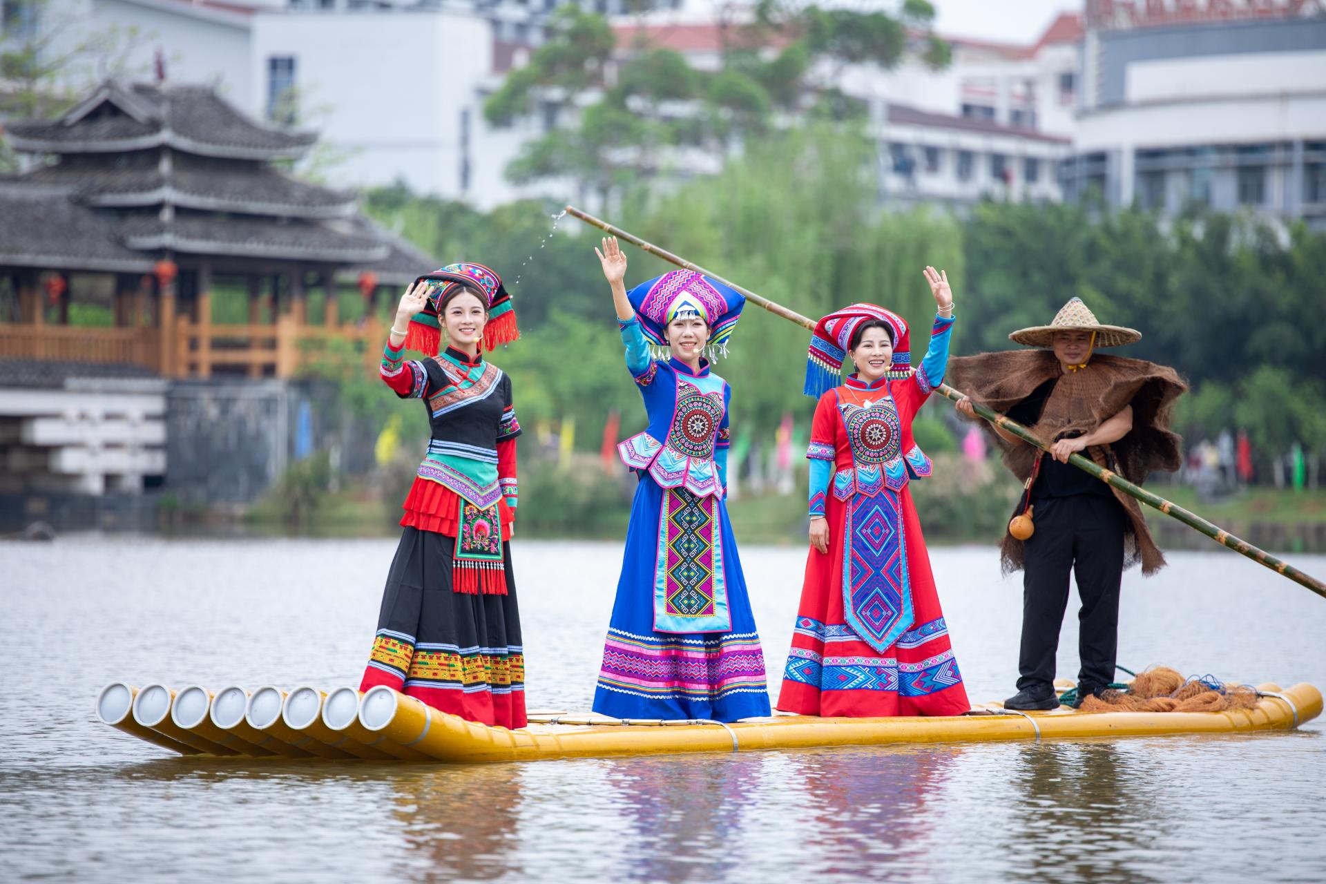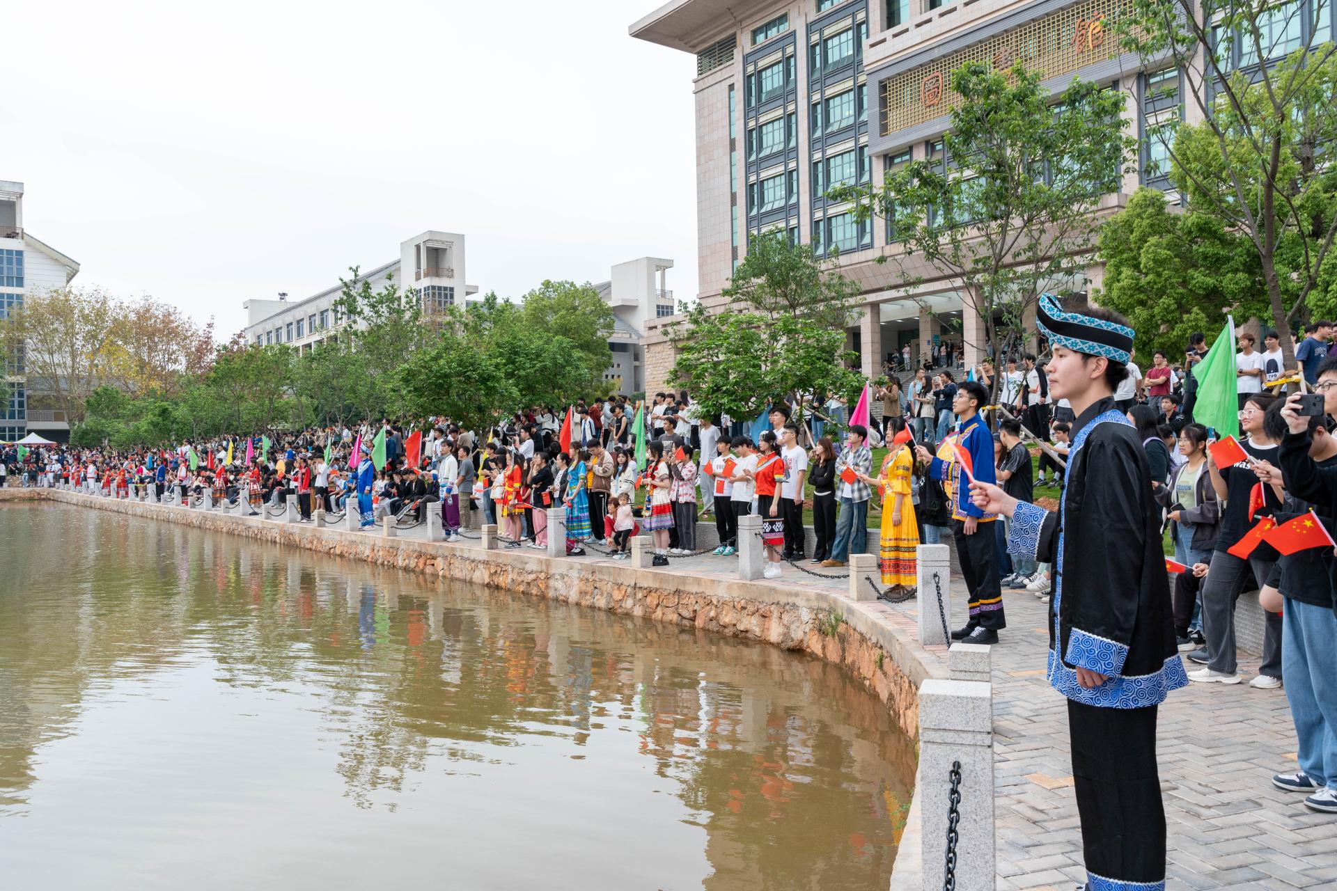 临近傍晚的不孤湖畔,欢歌萦绕,热闹非凡。伴随着熟悉的旋律,南院版“印象·刘三姐”随后在此上演。演出由学校教育学院黄钰善老师扮演的“刘三姐”从青秀风雨桥下乘竹筏驶出开始,以《山歌好比春江水》一曲唱响不孤湖中央。其后由两百余名学校不同年龄、不同地区、不同民族的表演者组成的民族歌阵,齐声唱响代表着广西三月三的耳熟能详的民族歌曲《广西尼的呀》《三姐的歌万人和》,生动展现了“壮族三月三”歌圩盛况。“我上春山约你来见,邀你一起驰骋跃马扬鞭,青春无限正好扬帆,前路灿灿在南院……”南院版《上春山》展示了师生的美好愿景。现场欢歌飞扬,激情回荡。表演最后,现场观众一起挥舞手中的国旗,引吭高歌,合唱《歌唱祖国》,用歌声表达对伟大祖国繁荣昌盛的美好祝愿,将会场活动推向高潮。