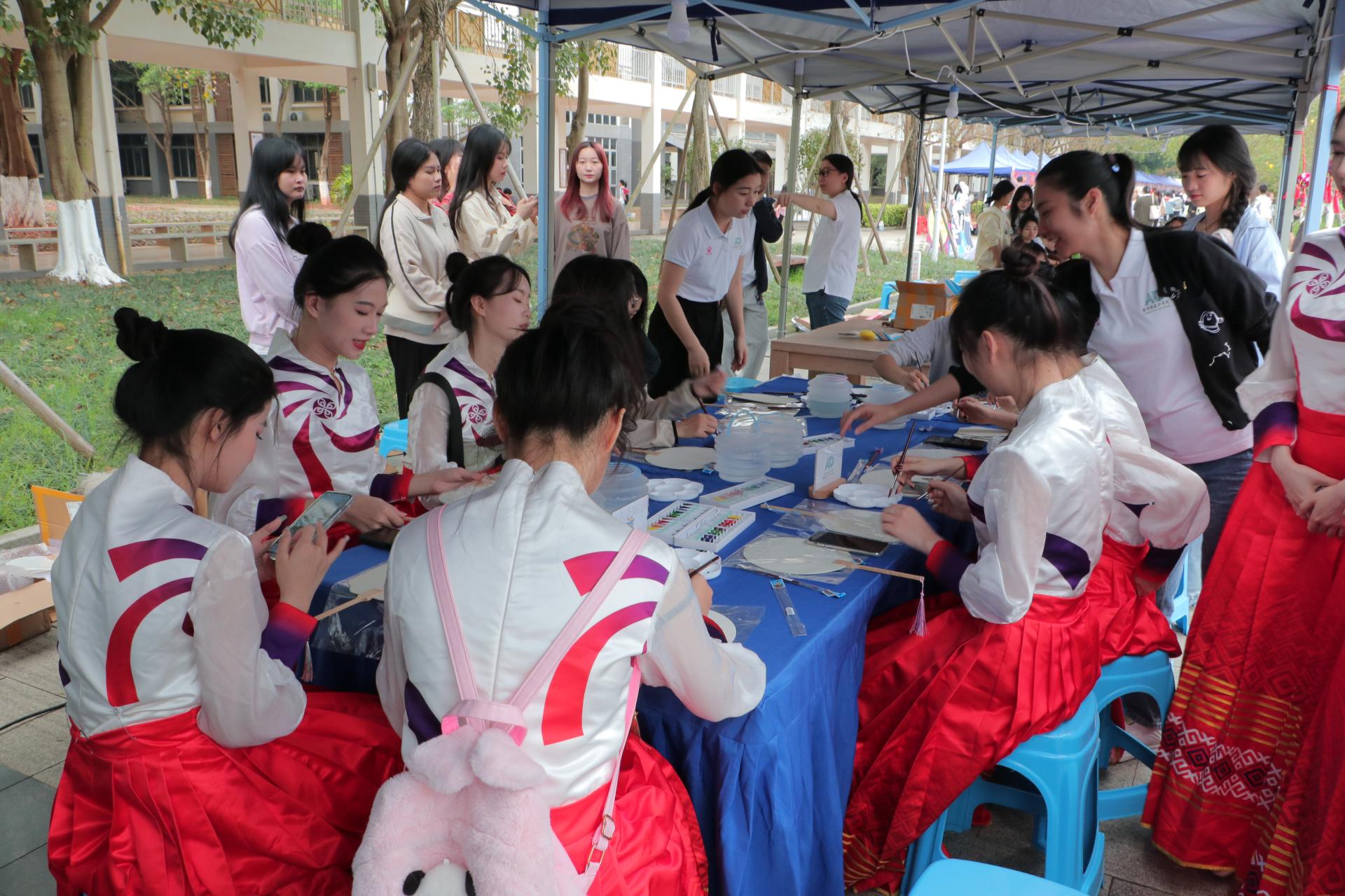走进民俗文化街区,学校师生身着广西少数民族盛装迎面而来。民俗文化街区设置了传统民俗艺术体验以及传统美食品尝摊位以推介风土人情,让师生们一站式打卡广西的特产风物。现场活动包括民族服装试穿、陶艺、绣球、香囊、壮锦、剪纸等手工艺品制作体验及展示。在此,老师同学们不仅可以品味艾叶粑粑、青团、彩蛋等壮族特色美食,还可以过一把唱山歌的瘾。民族趣味游园区,广西少数民族传统体育活动在此开展得如火如荼,竹竿舞榔声朗朗,节奏铿锵,表达着对五谷丰登、幸福吉祥的祈求和渴望;旁边的五彩绣球在挥抛中展现壮乡风情;投壶和三人板鞋趣味运动等多项深受师生喜爱的活动,吸引了师生的积极参与,现场气氛热烈,欢声笑语不断。沉浸式体验“广西三月三”,共同感受节日的欢乐和温暖。