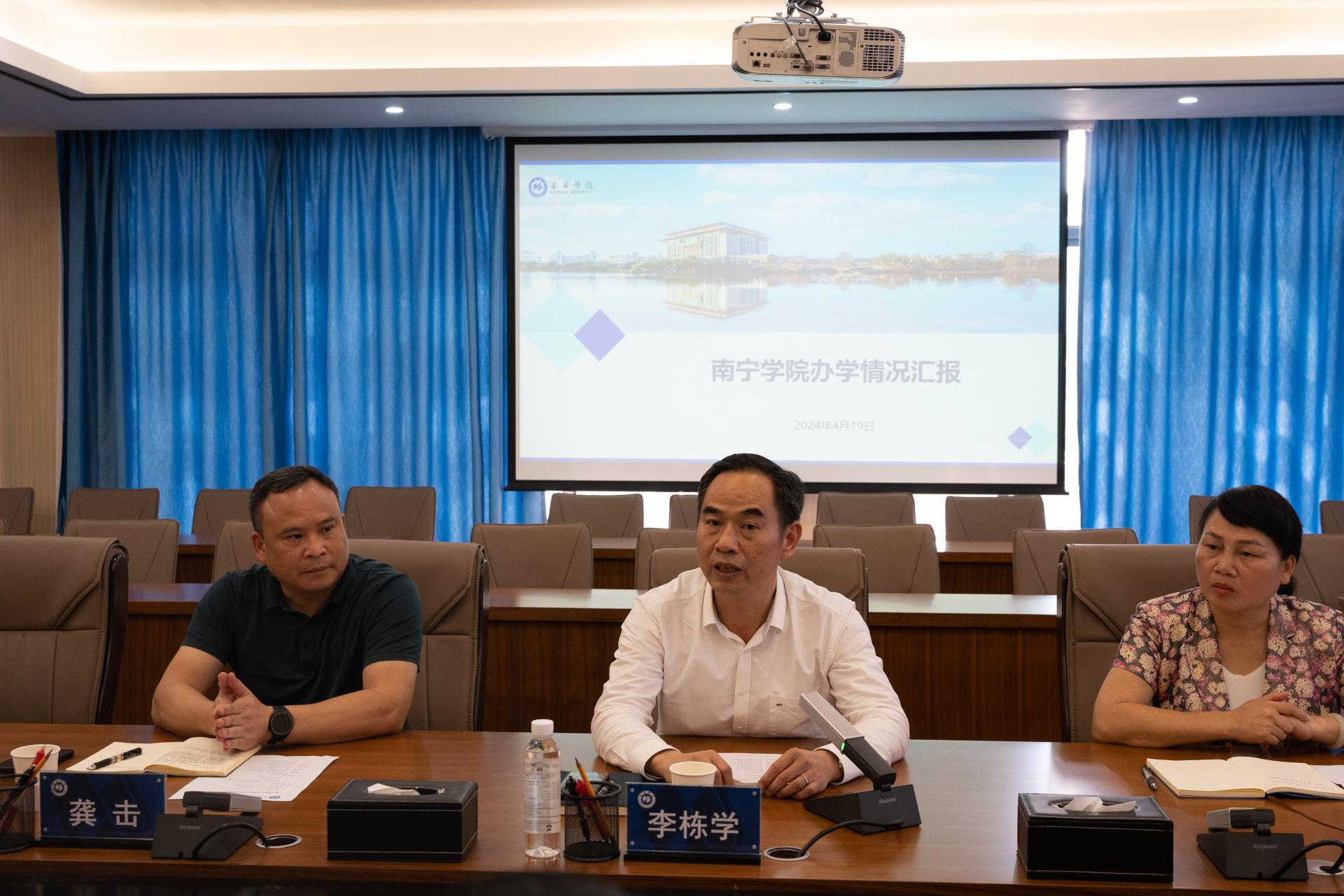 4月19日,南宁市邕宁区委书记梁国禄一行16人到校调研交流。校长李栋学主持座谈会。