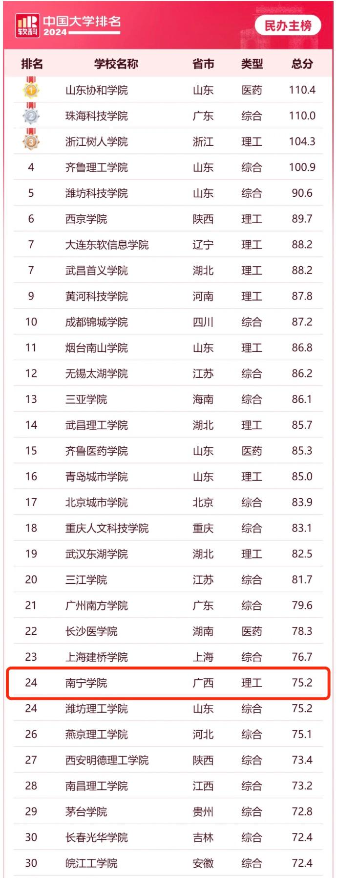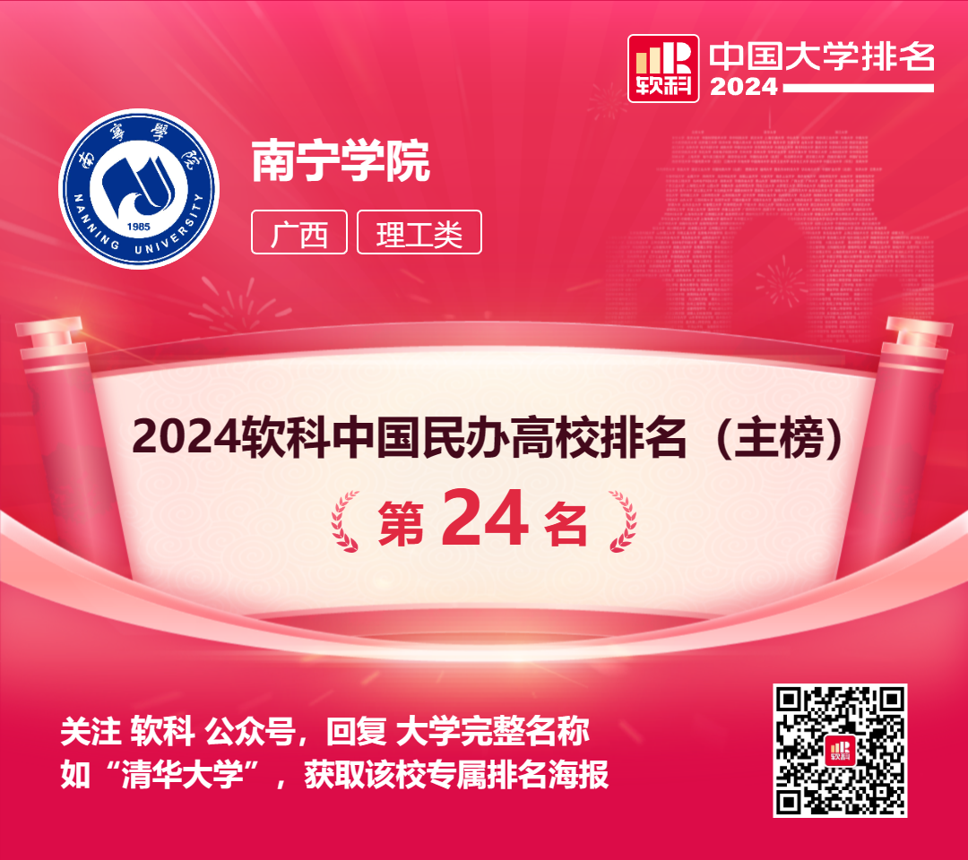 【喜讯】2024软科排名:南宁学院位列全国民办高校第24名,较上一年进步5名!!