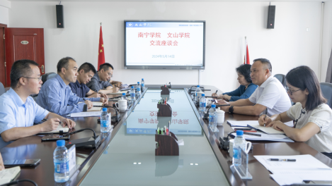 随后,文山学院戴顺祥副校长与龚击副校长一行进行座谈交流。座谈会上,戴副校长介绍了文山学院的办学历史沿革,总结了文山学院的办学特点,表达了两校合作的愿望。龚击副校长对文山学院的热情接待表示感谢,并提出文山学院将三七文化与人才培养、科学研究进行深度融合令人印象深刻,对南宁学院立足地方办学带来了很多启发。龚副校长提到,南宁学院与文山学院有着深厚的友谊,良好的合作基础,建议两校未来在学生交换交流、教师科研合作、国际交流与合作等方面,发挥各自优势,深入合作、共同进步。双方就合作内容进行深入交流,文山学院办公室主任、对外合作交流处处长刘方涛、教务处处长汤龙、三七医药学院院长辛文锋、三七医药学院党委书记韩荣玉、美术与设计学院院长孙华先后就合作内容提出建议,我校发展规划与合作交流处处长覃凤彩、食品质量与工程学院院长庞湘萍、艺术与设计学院副院长徐党卿就合作方式进行了回应,双方达成了合作共识。