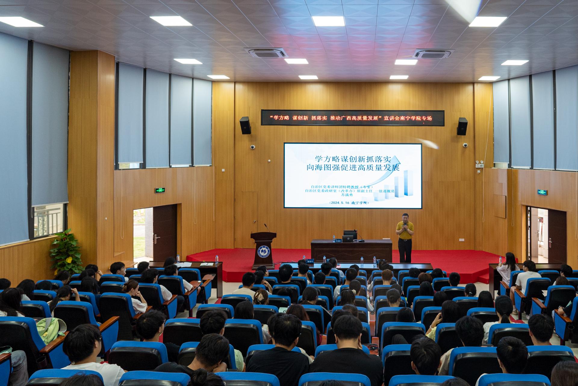 报告会上,自治区党委讲师团特聘教授苏满勇以“弘扬海洋文明,推动广西向海图强战略”为主题,结合广西具体区情,深入解读了习近平总书记对广西重大方略要求,进一步向师生们传达广西解放思想、创新求变,向海图强、开放发展的重要战略任务。让在场师生对习近平总书记对广西重大方略要求有了更深入更系统的了解。苏满勇教授的宣讲内涵丰富,深入浅出,既有理论高度又有实践深度,对我校师生准确把握习近平总书记对广西重大方略的精髓和内涵、深刻了解广西区域发展形势以及如何将习近平总书记对广西重大方略指导学校落实立德树人根本任务都提供了很好的工作思路和实践路径。