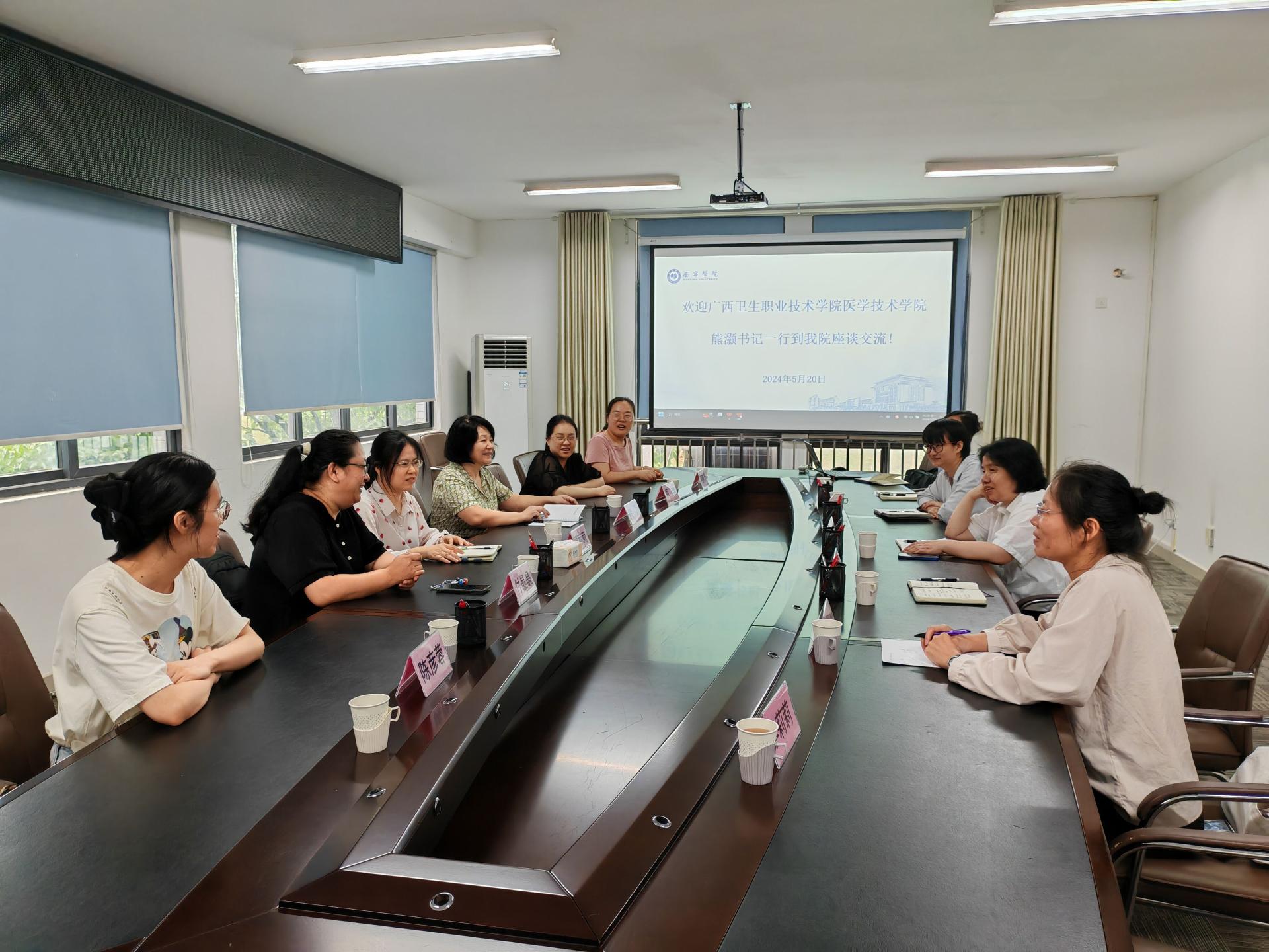 下午,广西卫生职业技术学院医学技术学院书记熊灏一行6人到我校食品与质量工程学院开展调研交流,食品与质量工程学院院长庞湘萍出席并主持座谈交流会,副院长韦云伊、党总支副书记蔡旭、食品营养教研室主任康超及其他骨干教师参加了此次交流座谈会。会上,庞湘萍对熊灏一行的到访表示热烈欢迎,并详细介绍了学院的办学历史、办学特色、专业建设和人才培养情况,进一步强调了院校之间跨学科专业深入交流和合作的重要性,并对当日晚上两院校联合开展的5.20中国学生营养日公益大讲堂的活动进展进行汇报,期望通过此次活动以及后续的交流与协作,共同提升院校合作的质量和水平。熊灏书记对南宁学院提供的热情接待表示衷心的感谢,并介绍了广西卫生职业技术学院医学技术学院的办学历程、人才培养策略以及学生就业情况等。她表达了对未来双方更广泛的院校合作领域以及合作方式的美好期望。最后,双方进行了自由提问和交流,在职业教育、本科教育、跨学科专业建设、人才培养与学生就业等多个领域展开了深入探讨。