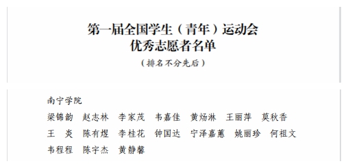 5月23日,我校收到第一届全国学生(青年)运动会执委会志愿者工作部通报表扬文件,南宁学院荣获第一届全国学生(青年)运动会志愿服务工作优秀组织奖,梁锦韵、赵志林、李家茂等17名学子荣获优秀志愿者称号。此举是对我校及志愿者在运动会中的表现给予了充分的肯定。