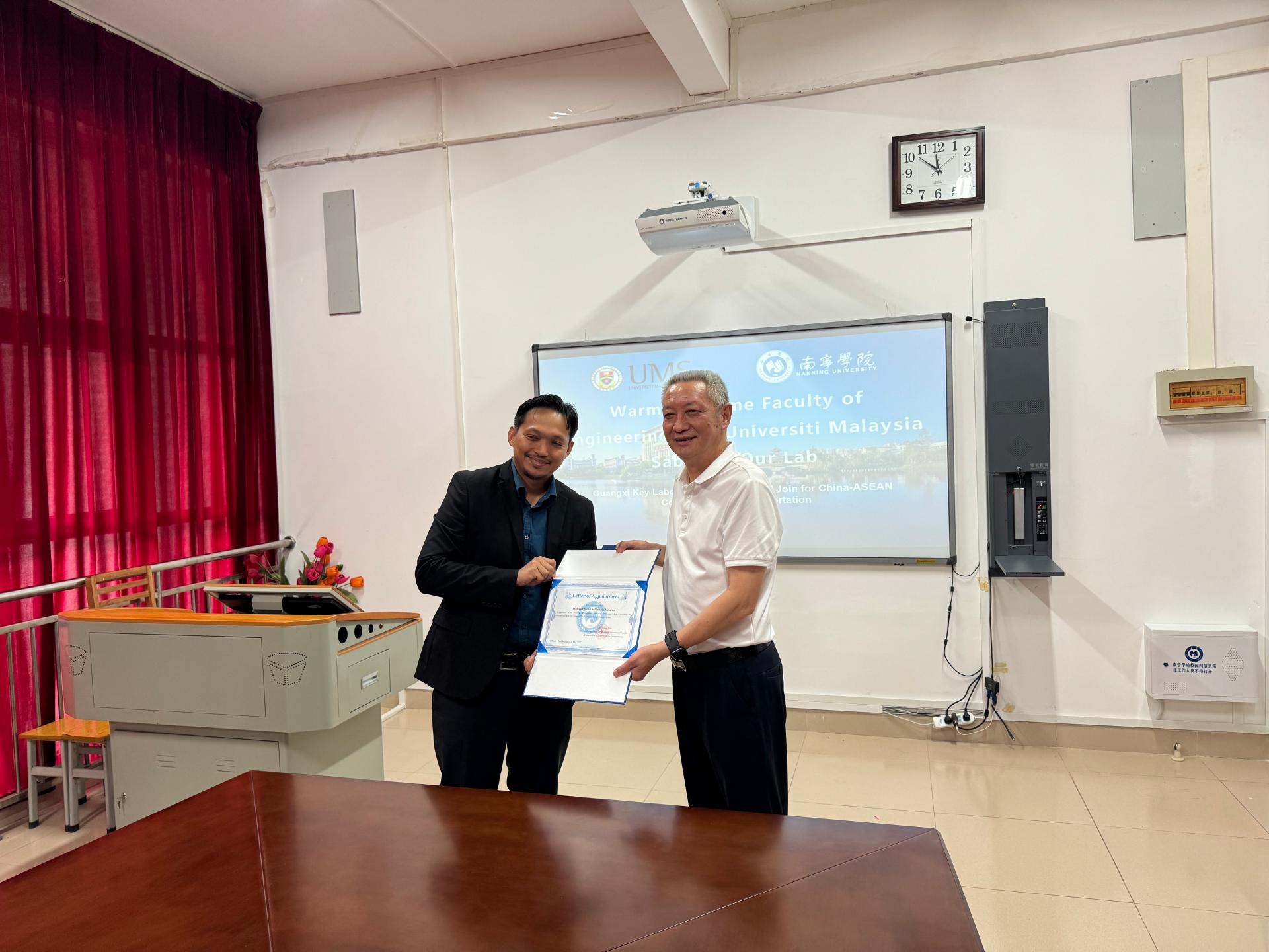 5月23日至5月24日,广西中国-东盟综合交通国际联合重点实验室(以下简称“重点实验室”)邀请马来西亚沙巴大学工程学院伊斯梅尔·本·萨阿德院长一行四人到访南宁学院并参加为期两天的学术交流与学术讲座活动。