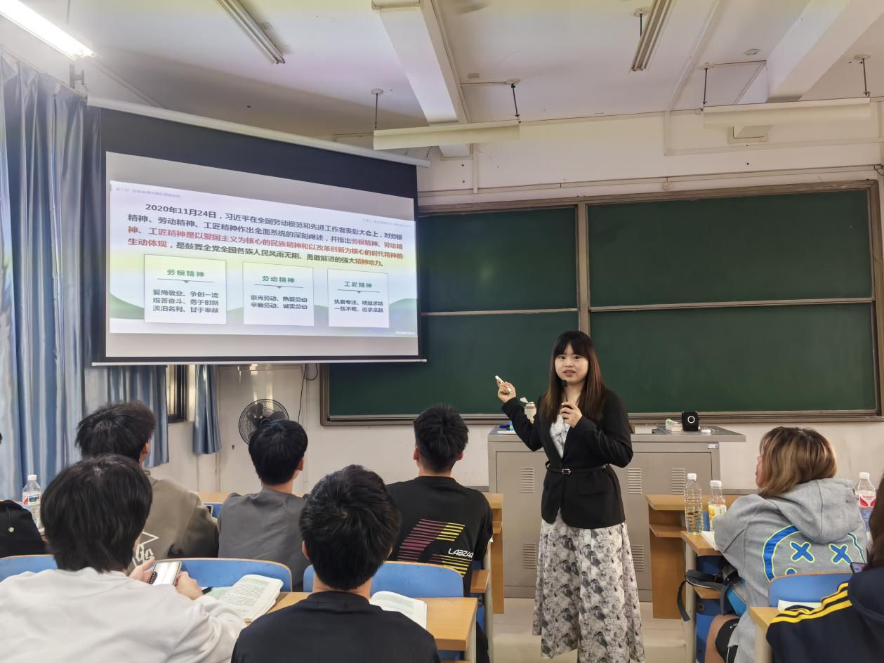 在谢雨欣老师的课堂上,教师重点围绕“工匠精神”带来了一场别开生面的分享。她通过讲述广西汽车集团有限公司钳工、高级技师郑志明从普通钳工到大国工匠的故事,引导学生深入理解“工匠精神”的深刻内涵。她穿插了郑志明在艰苦的训练环境中坚持不懈、在面对技术瓶颈时勇于突破的细节,让学生们深刻体会到大国工匠背后的辛勤付出与坚韧不拔。课后,老师还组织学生分组讨论,鼓励他们思考如何在自己的学习和未来职业中践行“工匠精神”,激发了学生们追求卓越、精益求精的热情。此外,一支由青马协会学生党员为骨干的学生宣讲团队,深入各班级、各社团开展“中国共产党精神谱系”的宣讲活动。
