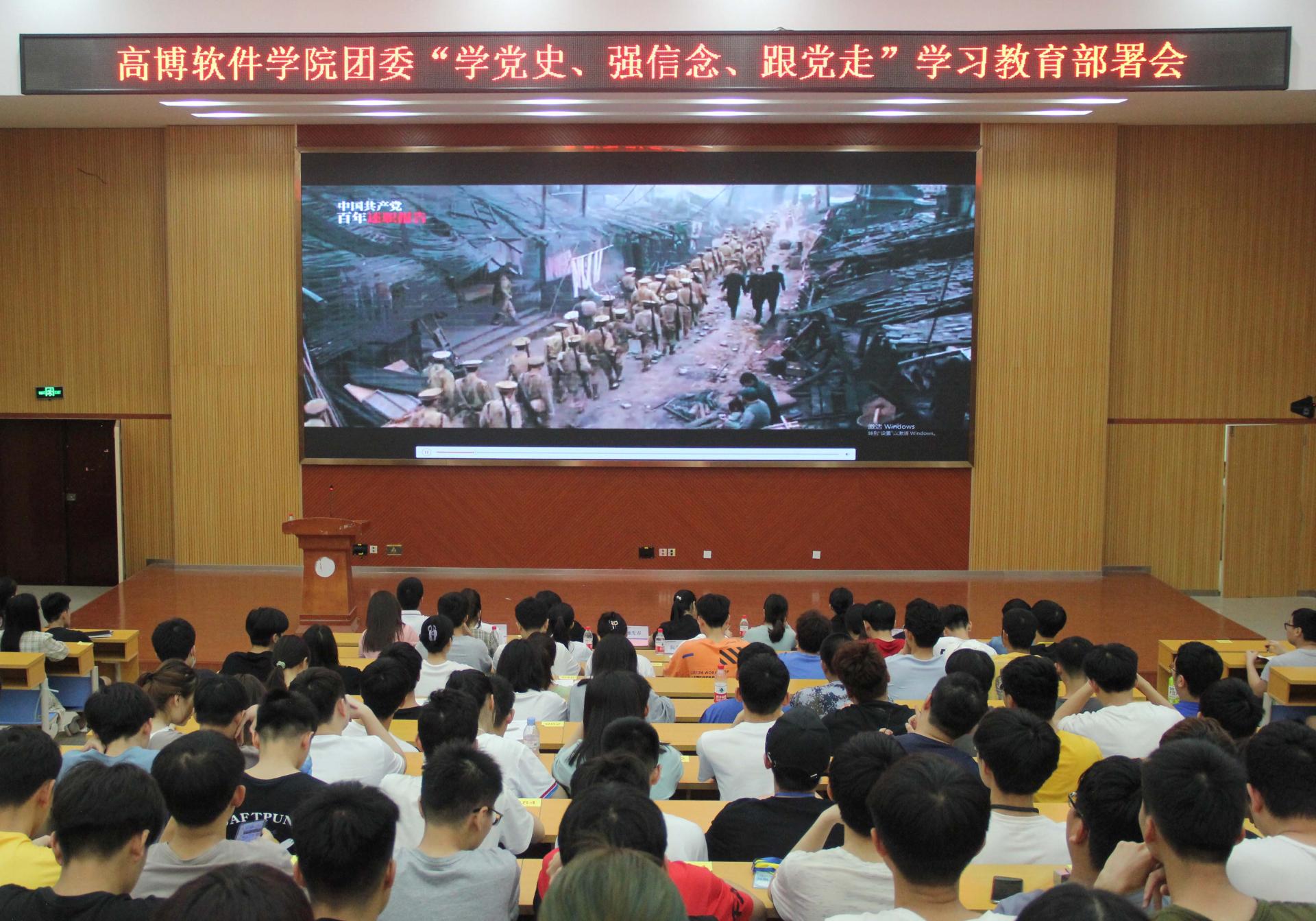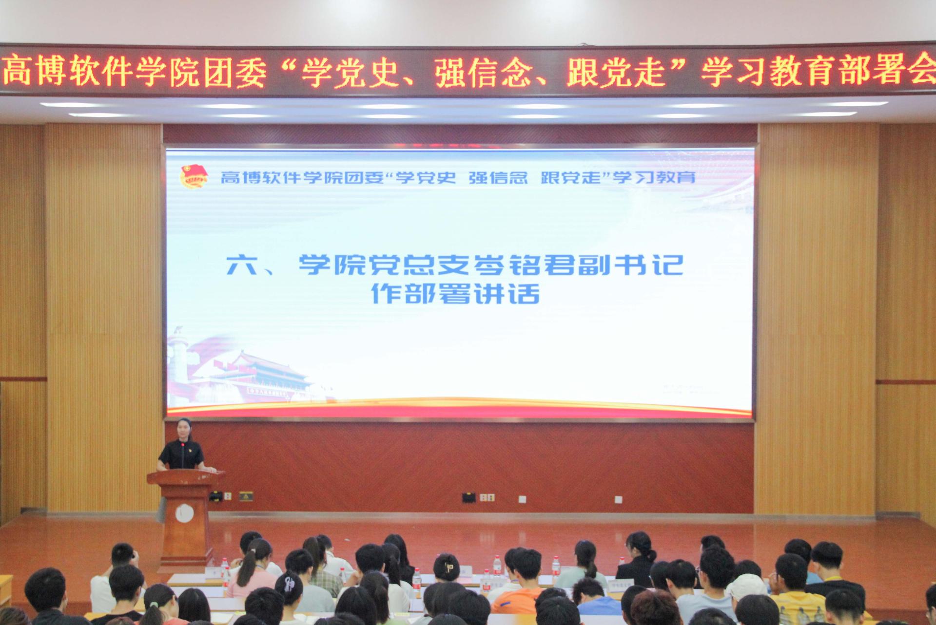 为深入学习贯彻习近平总书记在党史学习教育动员大会上的重要讲话精神,在学院团员青年中扎实推进党史学习教育,引导广大青年增强“四个意识”、坚定“四个自信”、做到“两个维护”,坚定不移听党话、跟党走。根据团中央统一部署,遵照团区委和学校团委相关要求,4月1日晚,高博软件学院团委召开“学党史、强信念、跟党走”学习教育部署会。高博软件学院党总支岑铭君副书记、学院青年教师代表、全体辅导员、学生组织全体人员、班级代表共计300余人参加部署会。部署会由高博软件学院团委书记杨先春老师主持。
