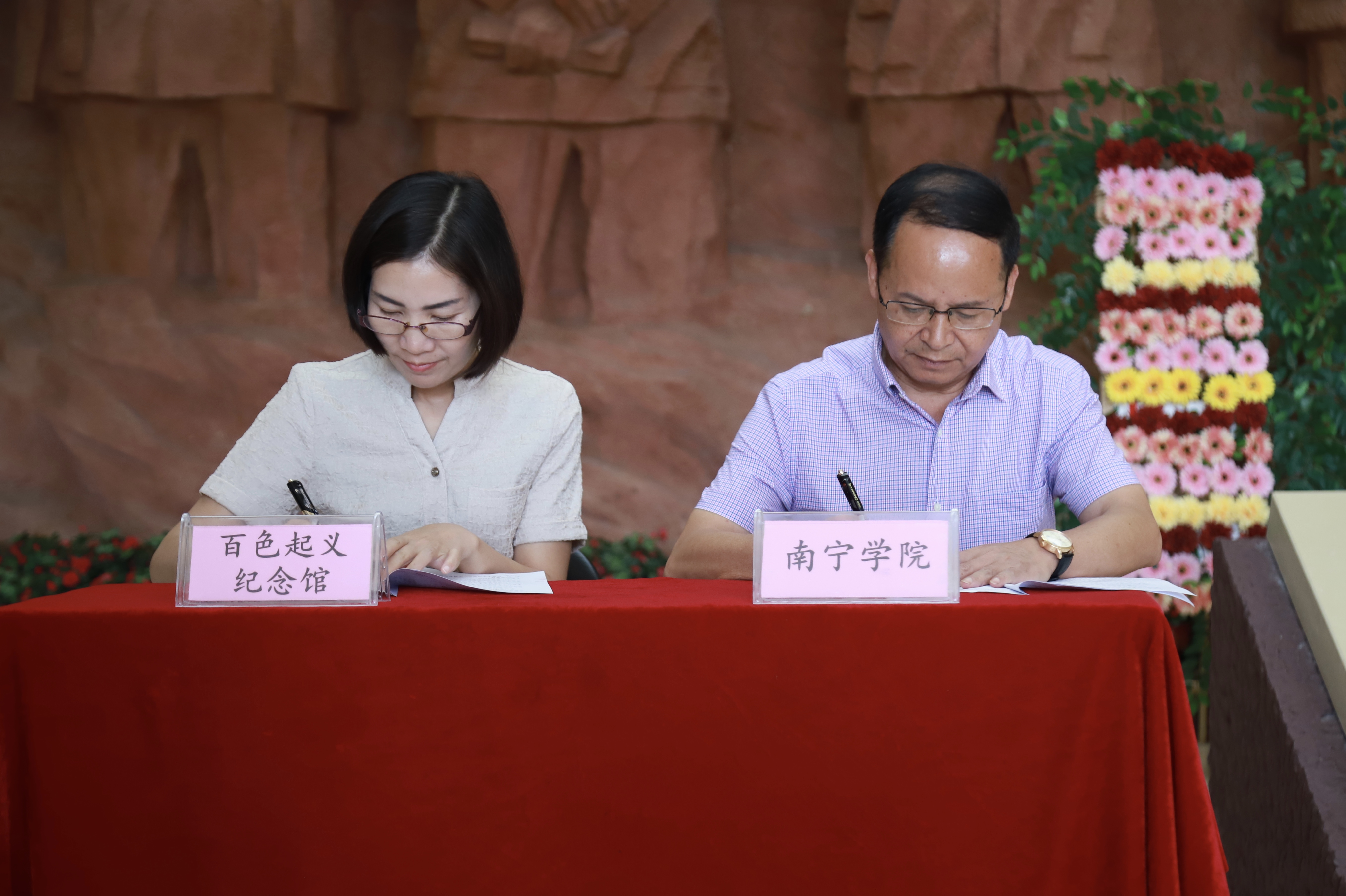 第二站,百色起义纪念馆。馆长何小燕、副馆长农逢新、副主任黄建清及工作人员参加仪式。何小燕馆长表示,双方共建基地既是责任也是机遇,百色起义纪念馆将按照协议要求,积极发挥作用,服务好共建单位,也期待南宁学院充分利用馆内红色资源开展爱国主义教育、党史教育,为馆内注入更多青春力量和社会力量。陈副校长指出,南宁学院在育人路上一直强调用红色精神给学生铸魂,与百色起义纪念馆共建基地对南宁学院乃至全区高校都具有重大意义。随后,何馆长、陈副校长代表双方单位签订协议书并举行了揭牌仪式。南宁学院一行参观了百色起义纪念馆。