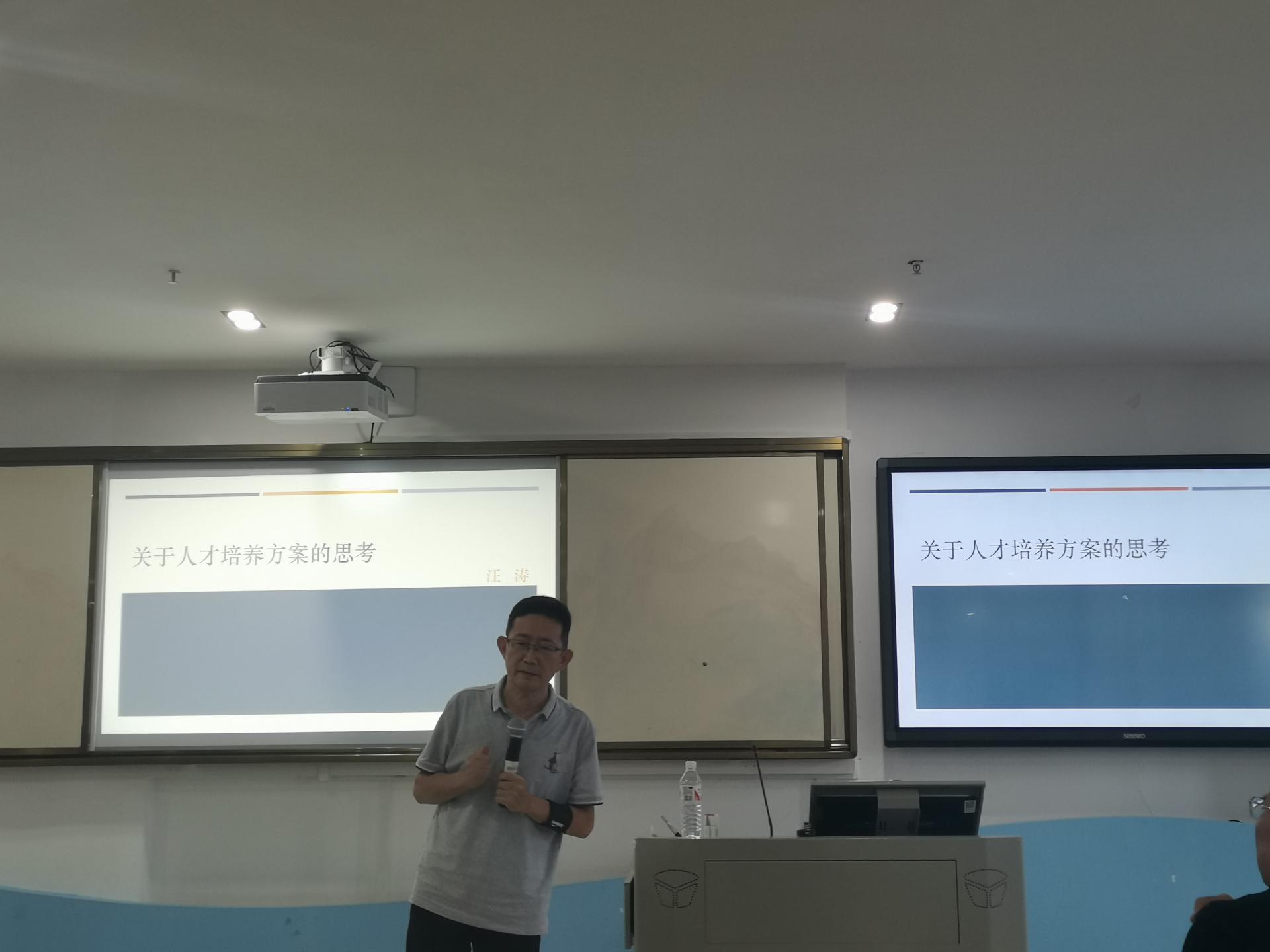 接着,学院副院长汪涛教授作《关于人才培养方案的思考》主题报告,报告以十问贯穿来指导各专业进行人才培养方案制订。汪副院长先从一问“我们需要培养怎样的人?”开始,希望培养爱党爱国、有情怀、有责任感、有爱心的正能量人才,同时具备会思考、能学习、善实践能力的人才。最后以十问“我们应该形成怎样的培养特色?”结束,就如何凸显专业特色提出意见及建议。
