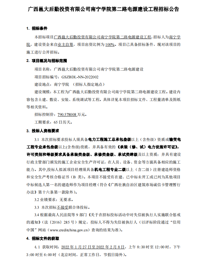 广西邕大后勤投资有限公司南宁学院第二路电源建设工程招标公告