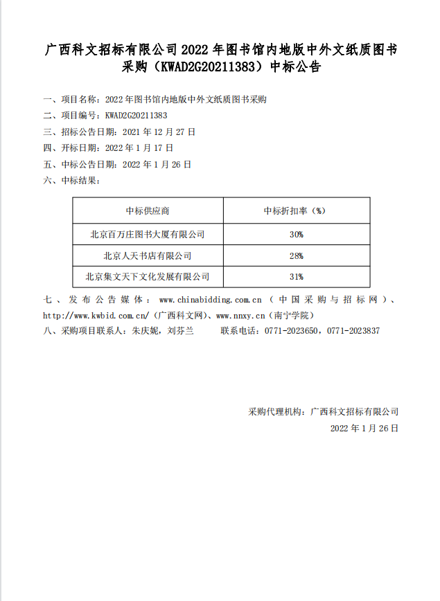广西科文招标有限公司2022年图书馆内地版中外文纸质图书采购(KWAD2G20211383)中标公告