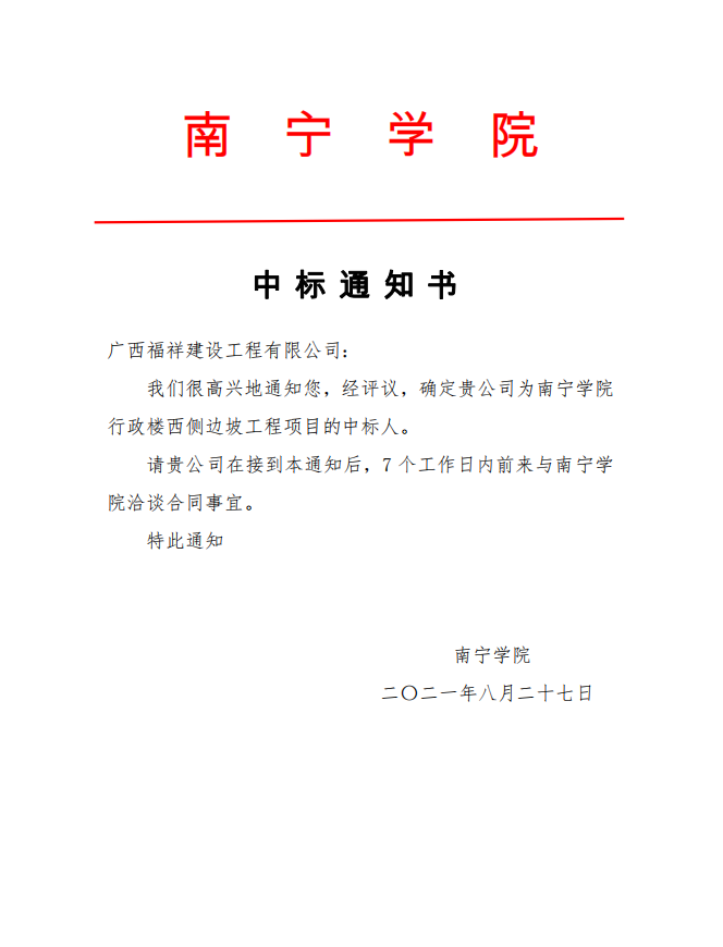 中标通知书(南宁学院行政楼西侧边坡工程项目)