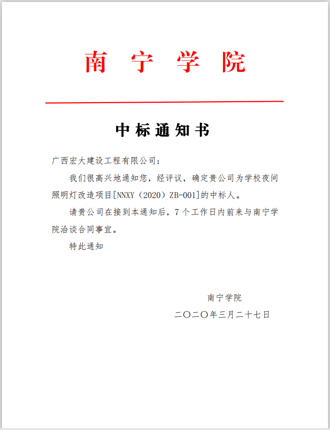 南宁学院夜间照明灯改造项目中标通知书